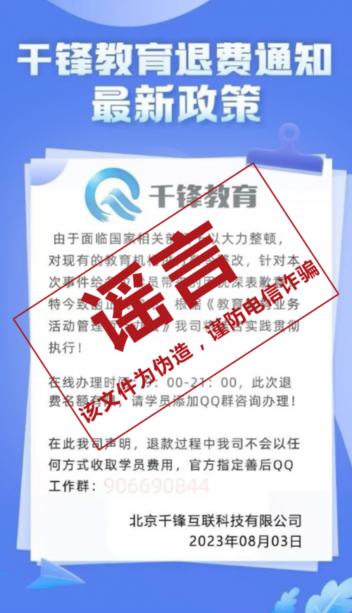 【警惕!退費】近期有不發分子以“千鋒教育”名義發布相關虛假文件、建立QQ群,誘導學員加好友、加退款群、手機短信等非法手段對用戶實施詐騙行為。 詳情>